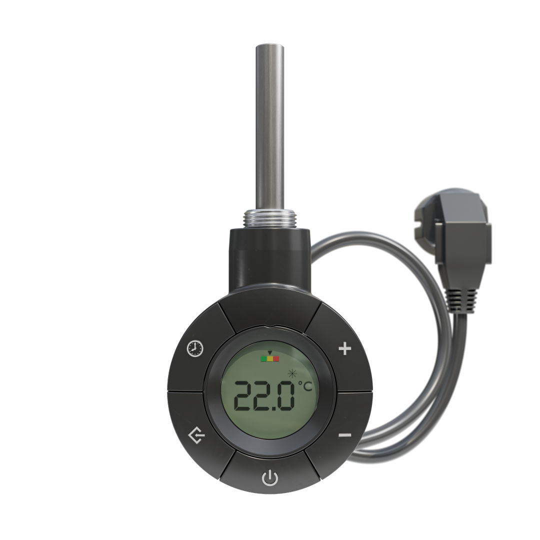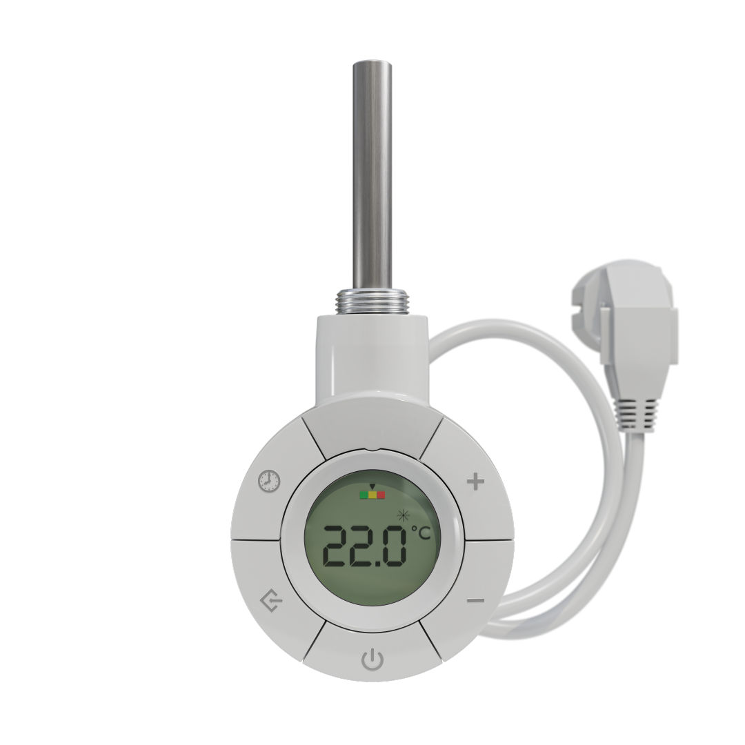Přírubový regulátor pro designová a koupelnová otopná tělesa v přídavném elektrickém vytápění nebo v elektrickém provozu. K dispozici v bílé nebo černé barvě, délka kabelu cca 0,90 m.