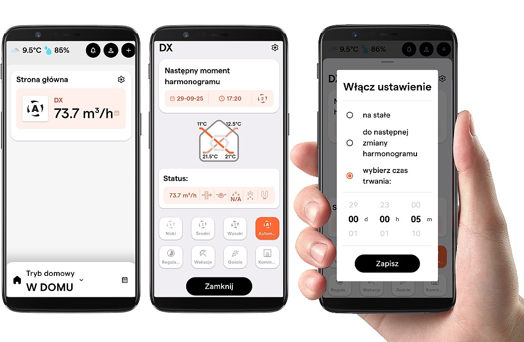 - Możliwość modyfikowania bieżącej pracy rekuperatora z dowolnego miejsca (niezbędna transmisja danych).